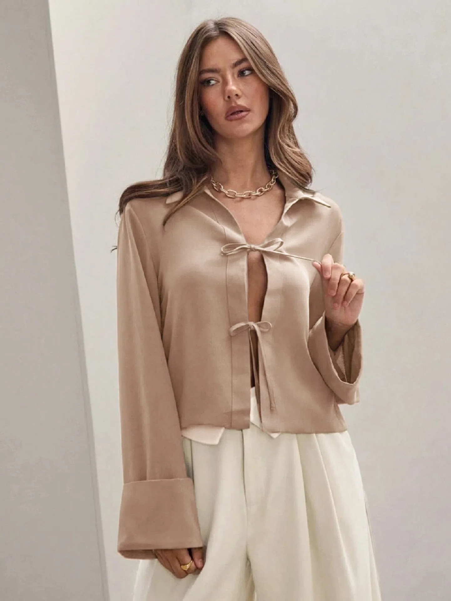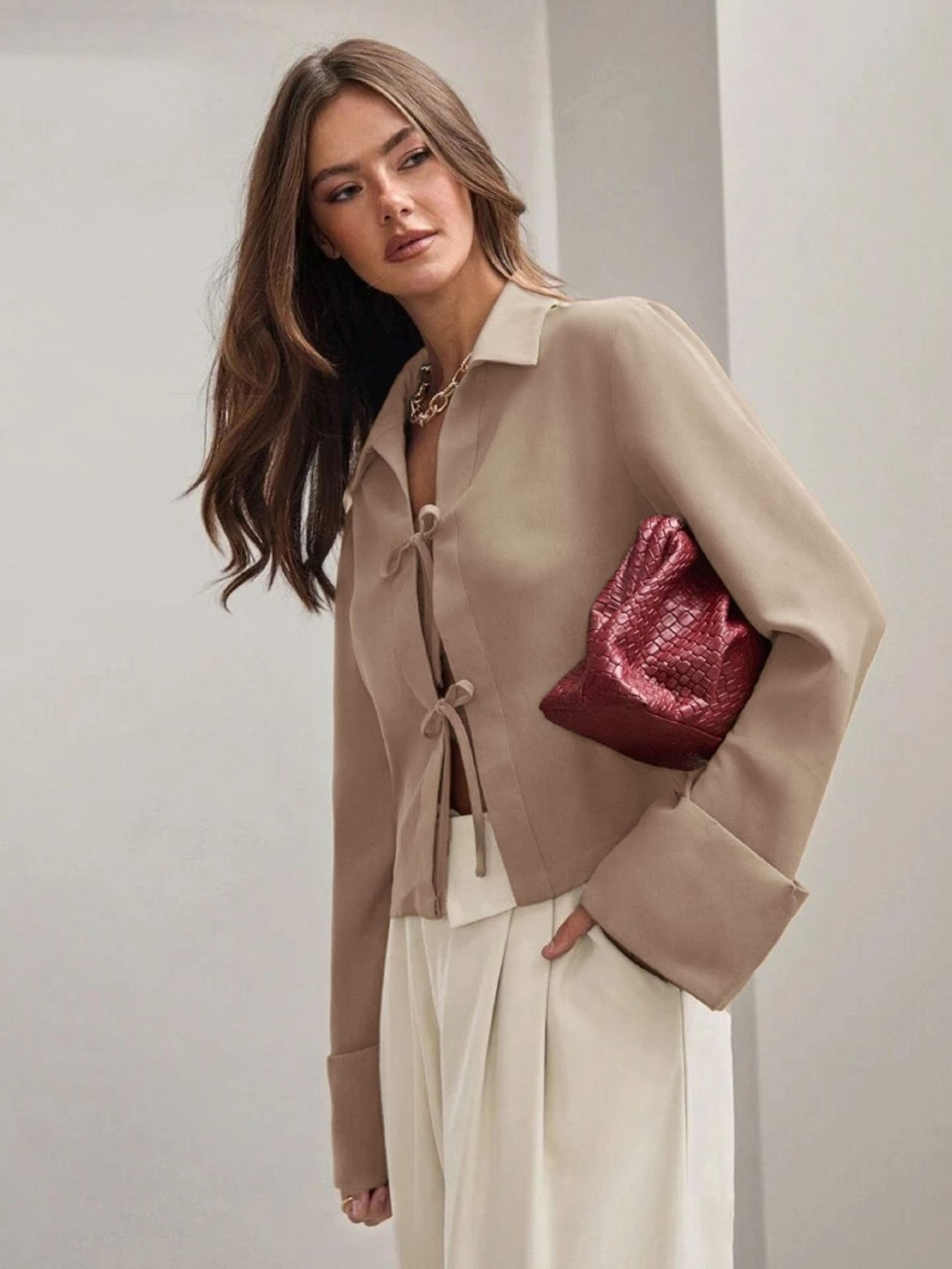 Effortlessly chic and versatile, this long-sleeve cardigan shirt blends a refined bowknot detail with a relaxed silhouette, making it ideal for workdays, commutes, and casual outings.